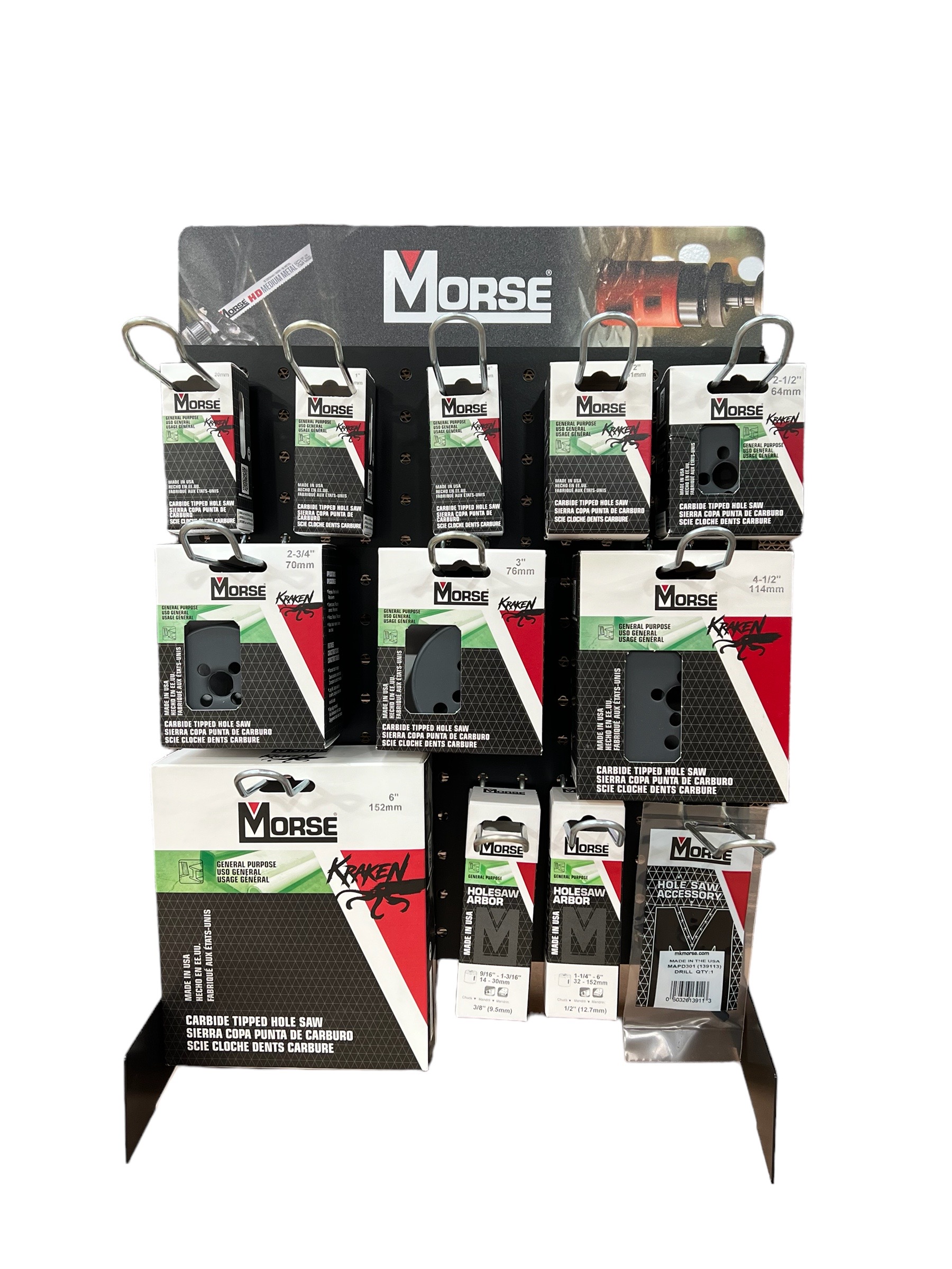 Morse Kraken Complete Stand - 23pcs 1 x 090-200-415 - 20MM Kraken Holesaw (MHSTK125) 1 x 090-200-435 - 25MM Kraken Holesaw (MHSTK16) 1 x 090-200-455 - 32MM Kraken Holesaw (MHSTK20) 1 x 090-200-510 - 51MM Kraken Holesaw (MHSTK32) 1 x 090-200-540 - 64MM Kraken Holesaw (MHSTK40) 1 x 090-200-555 - 70MM Kraken Holesaw (MHSTK44) 1 x 090-200-565 - 76MM Kraken Holesaw (MHSTK48) 1 x 090-200-625 - 114MM Kraken Holesaw (MHSTK72) 1 x 090-200-655 - 152MM Kraken Holesaw (MHSTK96) 2 x 090-205-025 - 5/8” - 18 Morse Arbor to fit holesaws 32-162mm (MA45PS) 2 x 090-205-005 - 1/2” - 20 Morse Arbor to fit holesaws 14-30mm (MA34) 10 x 090-210-017 - 6mm x 79mm Pilot drill for all arbors (MAPD301)