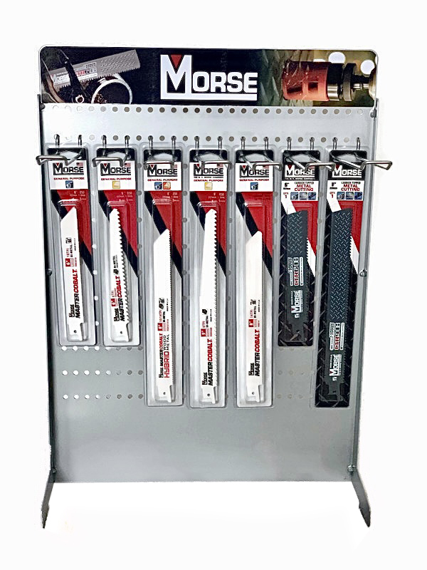 Morse Merchandising Reciprocating Blade Metal Stand 18pcs 2 x 105-240-052 - RECIP BIM HYB 8" 050 10/14 5PK 2 x 105-240-035 - RECIP BIM WOOD 6" 050 6T 5PK 2 x 105-240-012 - RECIP BIM MET 8" 035 14T 5PK 2 x 105-240-037 - RECIP BIM WOOD 9" 050 6T 5PK 2 x 105-240-020 - RECIP BIM MET 6" 035 18T 5PK 4 x 105-240-305 - RECIP C.TIP 6" X 1" 8T 1PK 4 x 105-240-310 - RECIP C.TIP 9" X 1" 8T 1PK